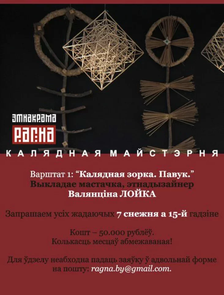 7 снежня адбудзецца першы варштат «Каляднай майстэрні» на тэму «Калядная зорка. Павук». Сваім майстэрствам і досведам падзеліцца мастачка Валянціна Лойка.