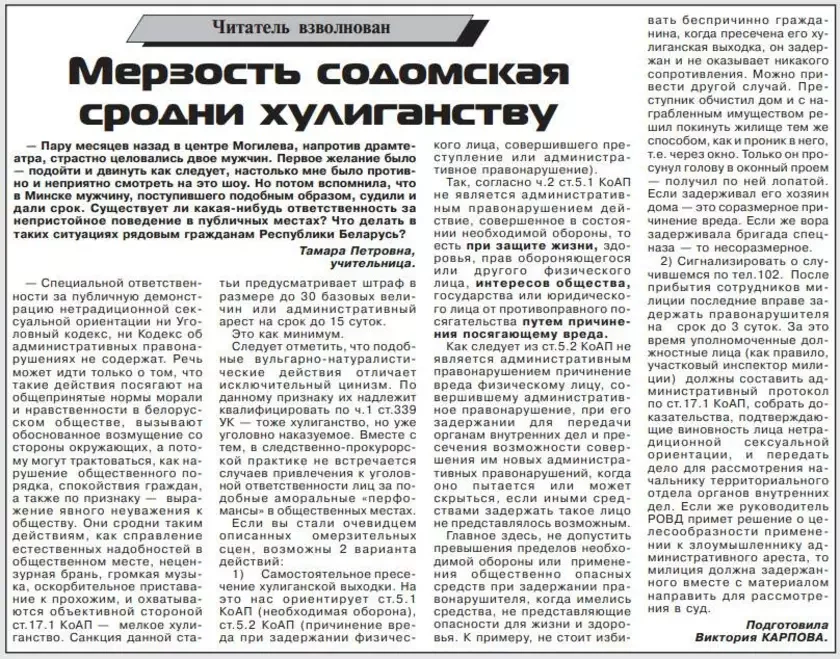 У скандальна вядомай газеце «Вечерній Могілёв» выйшла новая публікацыя, прысвечаная пытанню гомасэксуалістаў. На гэты раз выданне тлумачыць як трэба дзейнічаць, калі бачыш двух геяў, якія цалуюцца. Выданне прыраўнівае гэта да адміністратыўнага, а то і да крымінальнага артыкула «Хуліганства». Натуральна, што ніякага юрыдычнага абгрунтавання гэтыя парады не маюць. Сайт naviny.by паведамляе, што пад псеўданімам Вікторыя Карпава друкуецца галоўная рэдактарка «Вечернего Могілёва» Надзея Леўчанка.