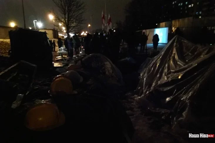 Пад нагамі раскладзеныя паддоны. каб ногі не моклі. Паўз намёты часам праходзяць амапаўцы. Ахова намётаў трымае з імі канструктыўны кантакт.