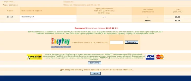 Калі ж няма магчымасці разлічыцца праз плацежную сістэму банкаўскай карткай, можна раздрукаваць квітанцыю на падпіску і аплаціць яе ў любым аддзяленні пошты.