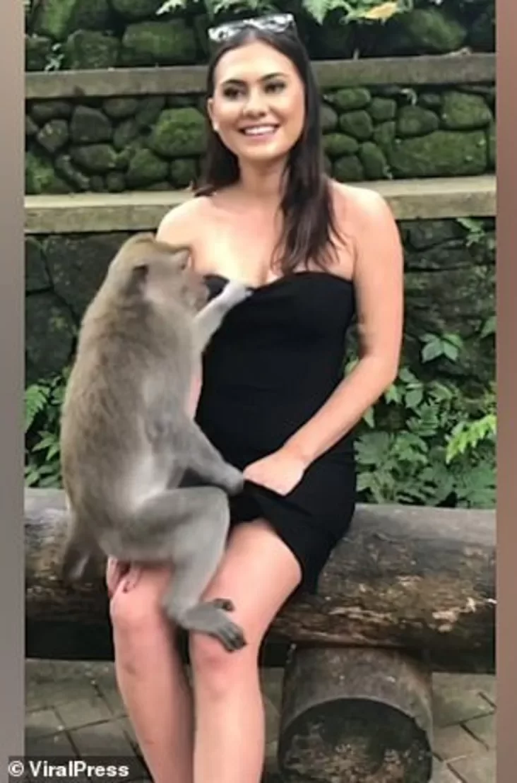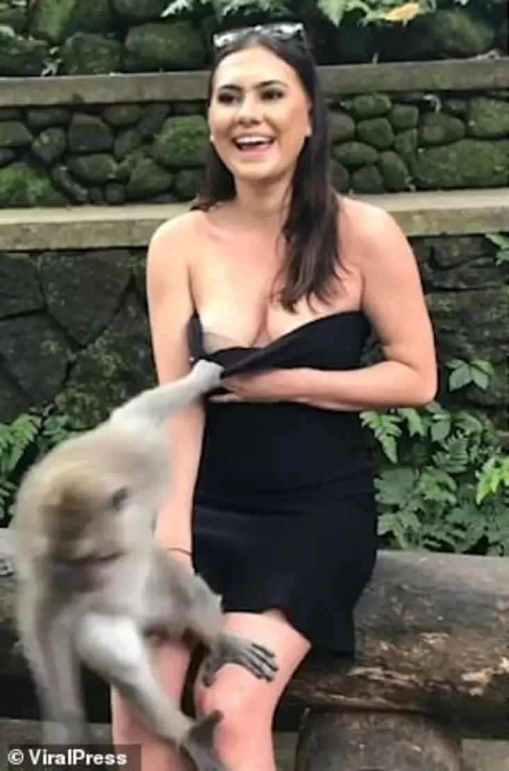 Затым нахабная малпа без папярэджання паспрабавала сцягнуць сукенку дзяўчыны, паказаўшы бюстгальтар.