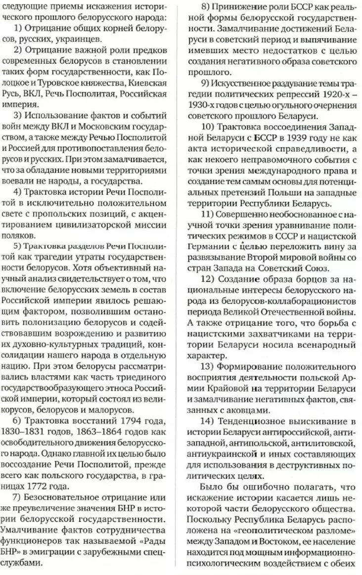 Аўтары таксама абараняюць БССР і савецкае мінулае. У лексікон вернуты нават выраз «штучнае раздзіманне тэмы трагедыі палітычных рэпрэсій 1920—1930-х гадоў з мэтай агульнага ачарнення савецкага мінулага Беларусі». Гэтая цынічная фармулёўка зневажае памяць мільёнаў бязвінных ахвяр савецкага рэжыму і, бадай, выкліча найбольшыя крыўды і абурэнне як нашчадкаў рэпрэсаваных, так і незалежных гісторыкаў.