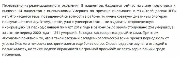 «Што тычыцца тэмы павышанай смяротнасці ў раёне, то вельмі раім канапным блогерам павывучаць статыстыку. Гэтаму, дарэчы, вучаць ва ўніверсітэтах — не выдаваць неправераную інфармацыю», — зазначае галоўны рэдактар.