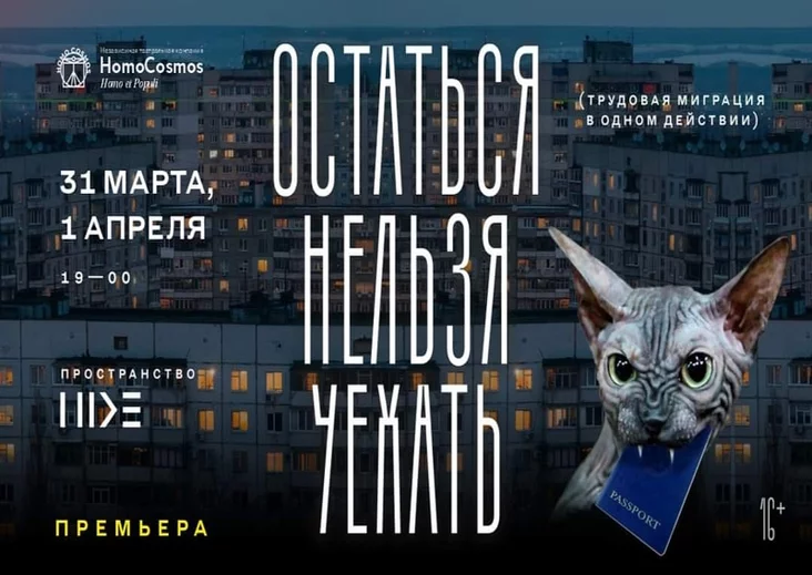 Спектакль ад незалежнай тэатральнай кампаніі HomoCosmos зроблены Змітром Багаслаўскім, адным з найлепшых маладых беларускіх рэжысёраў. Тэма гарачая: працоўная міграцыя. Аўтар п’есы — украінскі драматург Ігар Насоўскі. І тым больш каштоўны матэрыял, што граюць у ім акцёры Новага драматычнага тэатра, якія звольніліся адтуль пасля забастоўкі.