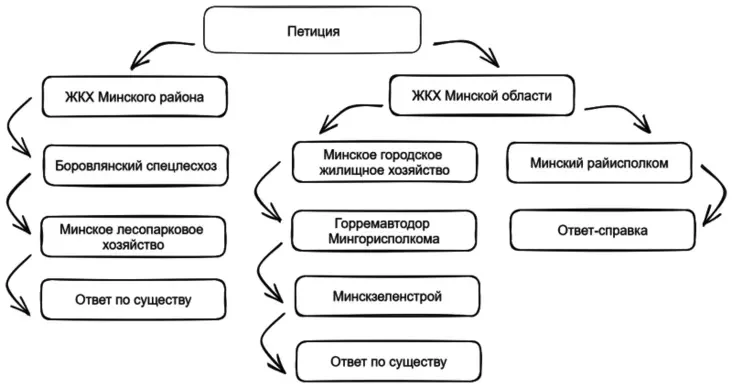 Першы атрымальнік — ЖКГ Мінскага раёна. Ад яго петыцыя трапіла ў Бараўлянскі спецлясгас (уваходзіць у Мінскае дзяржаўнае лесагаспадарчае аб'яднанне). А спецлясгас перанакіраваў зварот ва ўнітарнае прадпрыемства «Мінская лесапаркавая гаспадарка». Гэта даччынае камунальнае прадпрыемства ўваходзіць у структуру «Мінскзелянбуд».