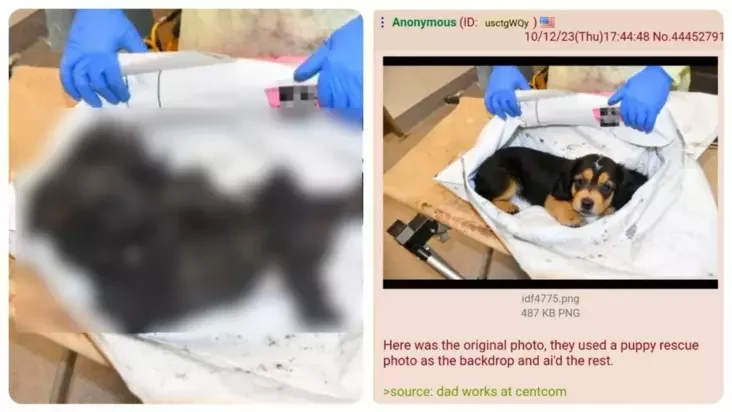 Для гэтага прапагандысты посцяць параўнальныя фоты забітага дзіцяці і шчанюка, здымак якога быў нядаўна апублікаваны невядомымі на інтэрнэт-платформах 4chan і Reddit. Апошняе фота ў дачыненні да першага выстаўляюць у якасці арыгінала.