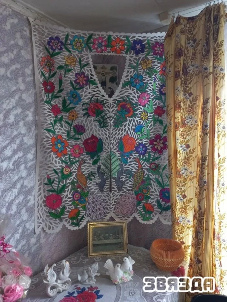 Леаніла Якаўлеўна дастае з шафы рулон старых шпалераў. Адразае невялікі прамавугольнік. Маўляў, «каб хутчэй было, зараз зробім набожнічак у мініяцюры. А так я звычайна адмяраю недзе метр па шырыні».