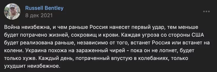 Бэнтлі — «ястраб» вайны, які агітуе за тое, што з Украінай нельга весці перамовы, а Кіеў трэба захапіць ваенным шляхам. Ён агітаваў за ўварванне ва Украіну яшчэ да 24 лютага 2024-га. Таксама Расэл зацята хваліць Пуціна, Прыгожына і Лукашэнку.