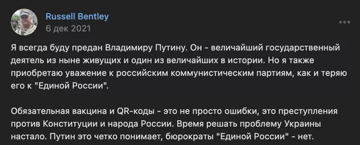 Праўда, не з усім у палітыцы РФ ён згодны. Напрыклад, ён крытыкаваў улады за абавязковую вакцынацыю ад кавіда, а ў смерці Прыгожына абвінаваціў «здраднікаў унутры Расіі».