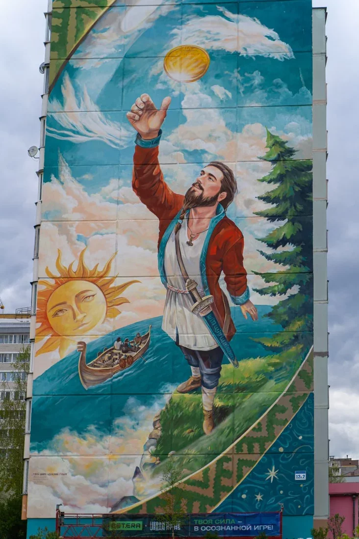 Мурал адсылае да старажытнай гісторыі Віцебска — да часоў гандлёвага шляху «з варагаў у грэкі». На сцяне намаляваны вараг, які падкідвае манетку: ён хоча даведацца, ці ўдалы шлях чакае яго наперадзе, паведамляе Betera.