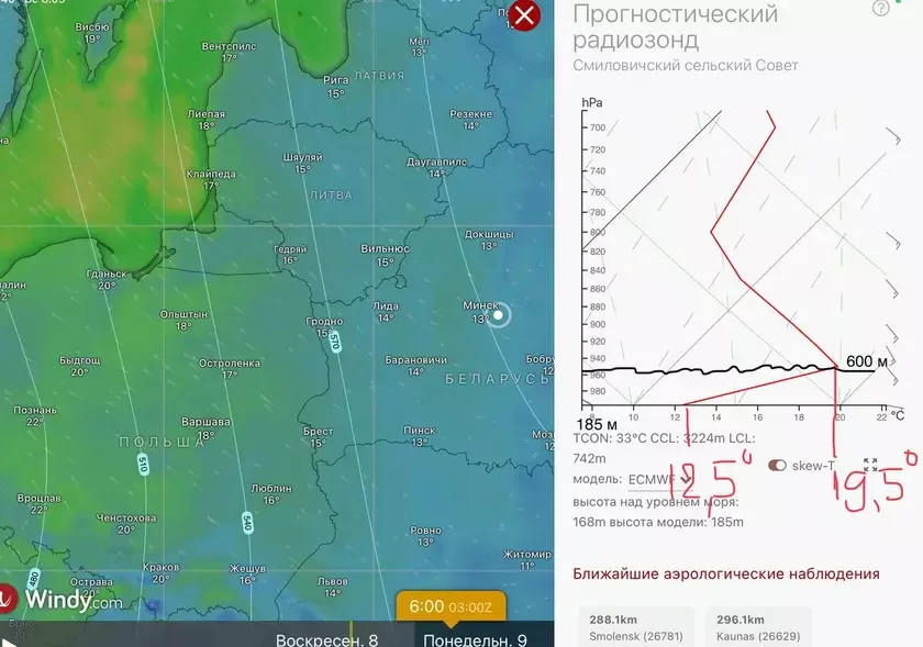 На дыяграме — прагноз да заўтрашняй раніцы. Атрымліваецца, што каля паверхні (185 м, вышыня Смілавіч над узроўнем мора) прагназаваная тэмпература будзе +12.5°, а на вышыні 600 м — + 19.5°. Такім чынам, таўшчыня інверсійнага пласта складзе ~400 м, а глыбіня інверсіі атрымліваецца аж 7°.