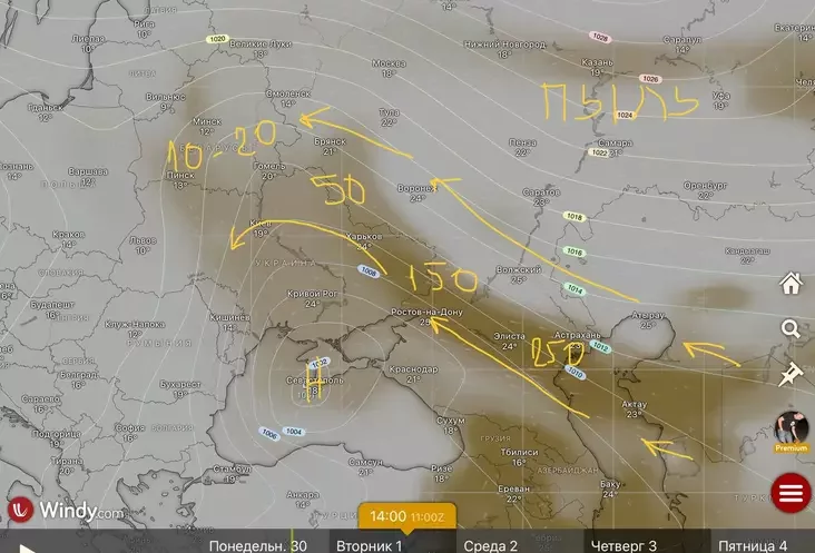На думку аўтара канала, цэнтральнаазіяцкі пыл даляціць да нас заўтра раніцай, бо патокі ў атмасферы для гэтага спрыяльныя. Праўда, канцэнтрацыі яго будуць даволі нізкія.