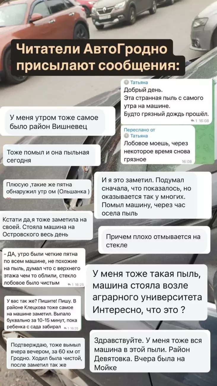 Сёння, 1 кастрычніка, у рэдакцыю выдання «АвтоГродно» прыйшлі дзясяткі фотаздымкаў брудных аўтамабіляў. Уладальнікі, якіх жывуць у розных раёнах, гавораць у адзін голас: «Толькі памыў, ужо зноў у пыле».