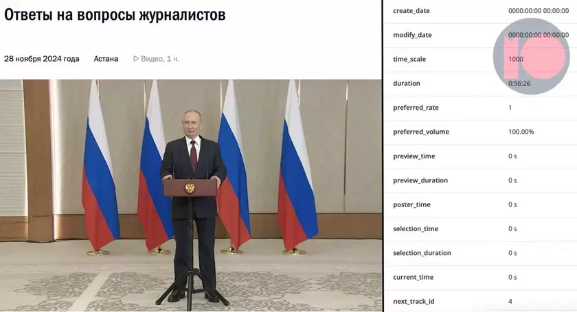 Выдаленыя метаданыя і з відэазвароту Пуціна, у якім ён распавёў аб выкарыстанні ракеты «Арэшнік».