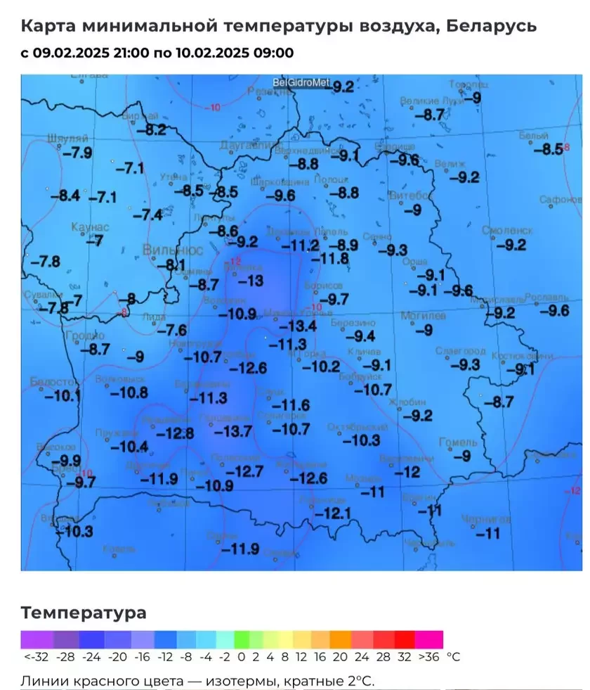 Халадей было на захадзе і ў цэнтры краіны. У Вілейцы было мінус 13°, у Стоўбцах — -12,6°, Ганцавічах — -12,7°.