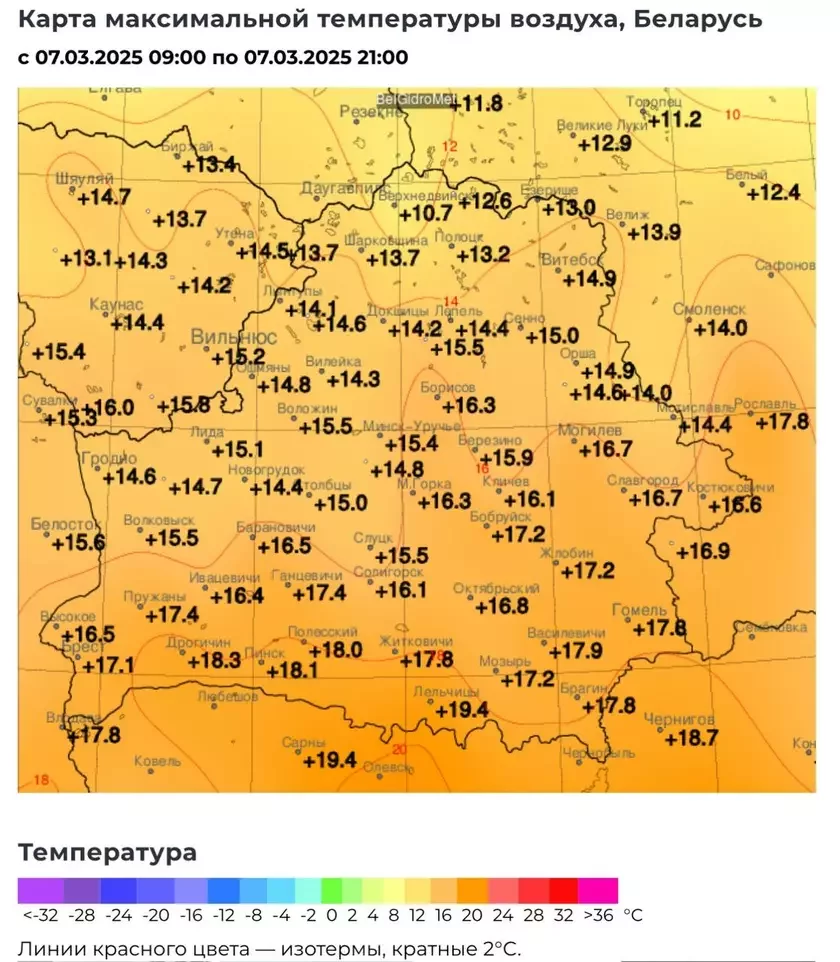У Драгічыне было +18,3°С, у Пінску + 18,1°С, у Мінску +15,4°С. У Верхнядзвінску +10,7°С.