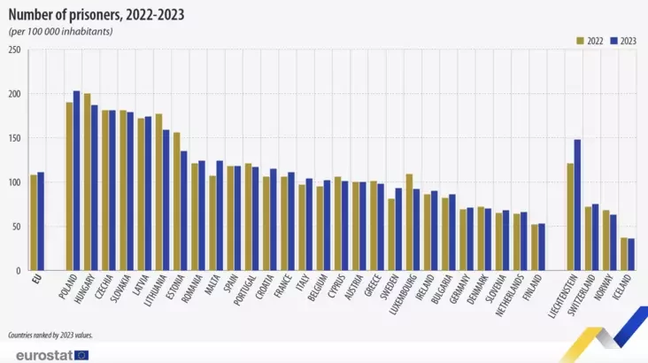 Пры параўнанні краін ЕС, найвышэйшы ўзровень зняволеных на 100 000 чалавек у 2023 годзе быў у Польшчы (203), за ёй ідуць Венгрыя (187) і Чэхія (181).