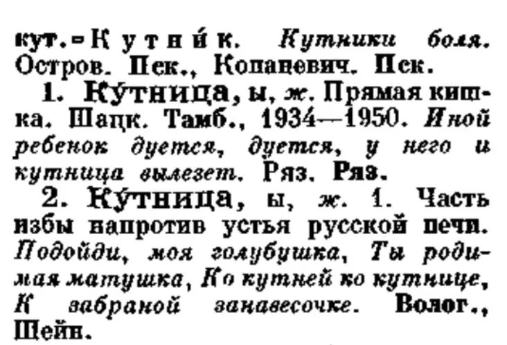 «Слоўнік украінскай мовы», складзены ў пачатку XX стагоддзя Барысам Грынчанкам, фіксуе слова кутни́ця з тым жа значэннем ‘прамая кішка’ ў Радамысльскім павеце Кіеўскай губерні, які, варта адзначыць, межаваў з Мінскай губерняй. Куды менш верагодна, што з беларускім уплывам гэта слова ку́тница, укладзенае ў «Слоўнік рускіх народных гаворак», з’явілася ў рускіх гаворках Шацкага павета Тамбоўскай губерні і Разанскім павеце Разанскай губерні. Дарэчы роднаснае польскае kątnica абазначае зусім іншую кішку — сляпую.