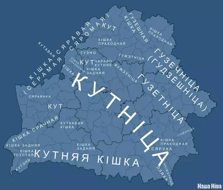 Так, напрыклад, у Мёрскім, Вілейскім і Дзятлаўскім раёнах як абазначэнне прамой кішкі зафіксаванае слова кут, у Маларыцкім — кутэ́нь, у Кобрынскім, Драгічынскім, Пінскім, Слонімскім, Лельчыцкім і Мазырскім раёнах — то бок амаль па ўсім беларускім Палессі — ку́тняя кішка, у недалёкім Ляхавіцкім раёне іншая форма — ку́ткавая кішка, у Вілейскім раёне — чараво ку́тняе, і нарэшце ў Ашмянскім раёне і Віленскім раёне Літвы — кутава́я кішка.