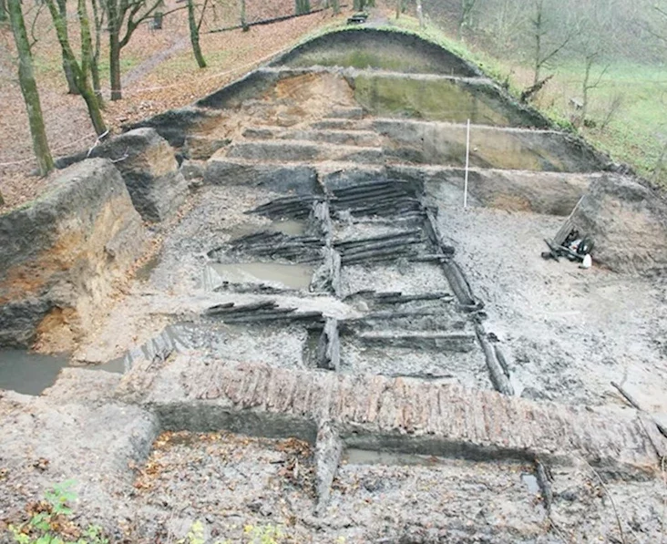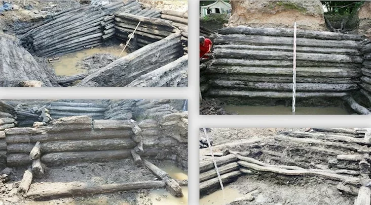 На глыбіні 6 метраў з’яўляюцца квадратныя абрысы пабудоў са спарахнелага дрэва. Гэтыя абрысы супадаюць з вертыкальнай лініяй на разрэзе вала — гэта рэшткі першапачатковай драўлянай сцяны, верхняя частка якой завалілася ўнутр гарадзішча.
