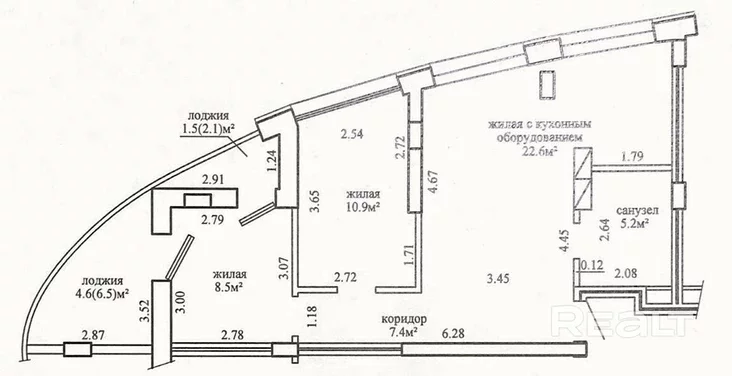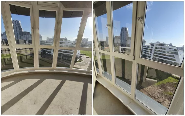 Кватэра складаецца з кухні-гасцёўні з панарамнымі вокнамі, а таксама двух жылых пакояў. З вокнаў адкрываецца від на вуліцу, у тройцы — некалькі лоджый (з выхадам з аднаго пакоя) і сумешчаны санвузел.