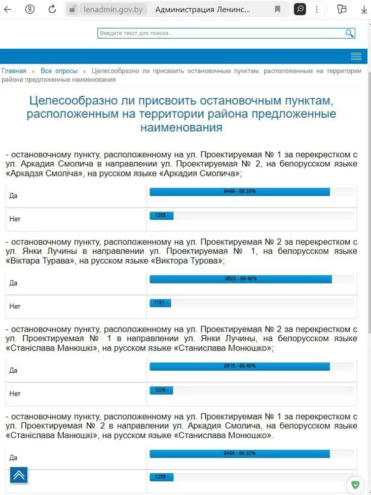 Летась на сайце адміністрацыі Ленінскага раёна Мінска вынеслі на абмеркаванне пытанне наймення прыпынкаў грамадскага транспарту, прапанаваўшы выказацца наконт імёнаў кампазітара Станіслава Манюшкі і географа Аркадзя Смоліча, у гонар якіх названыя суседнія вуліцы. Прарасійскія актывісты пяць дзён ціха накручвалі галасы супраць, але пасля таго, як пра апытанку даведалася шырокая грамадскасць, сітуацыя хутка павярнулася наадварот.