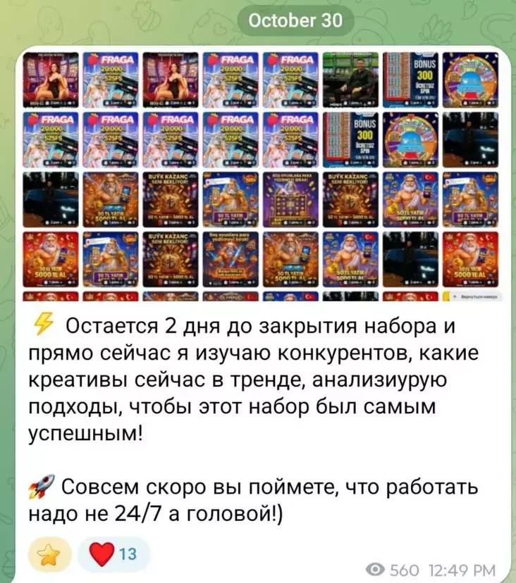 З гэтых кірункаў цалкам белы — толькі e‑commerce. Праўда, у сваім канале Белавусаў не публікуе скрыншотаў з рэкламы нічога, акрамя казіно. У курсе ён прапануе тым, хто купіць курс, загатоўкі так званых крэатываў — гатовых банэраў пад рэкламу азартных гульняў.