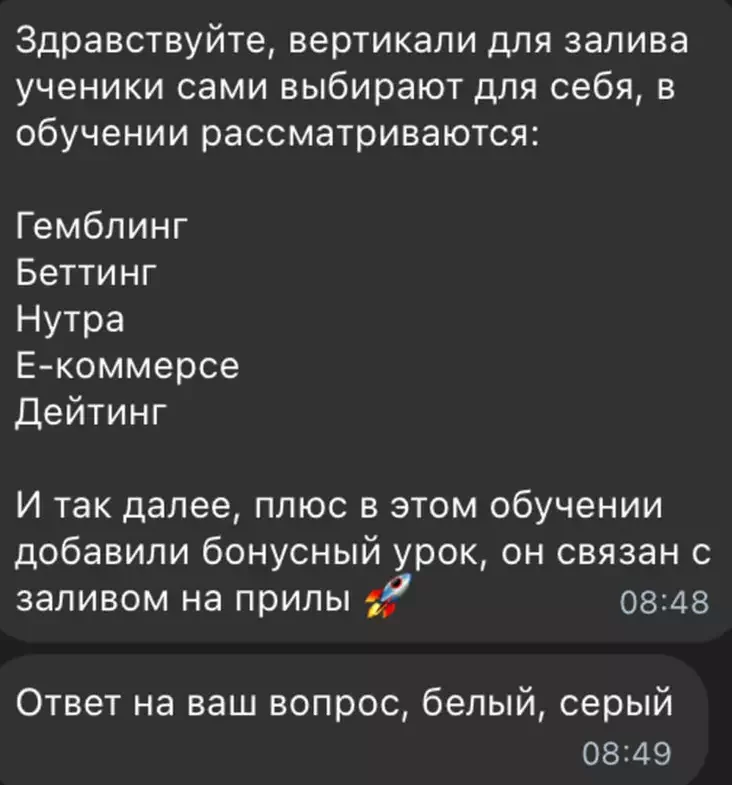 Курсы Белавусава, калі меркаваць па ягоным канале, вучаць у асноўным таму, як зарабляць на так званым шэрым арбітражы. Ідэя ў тым, каб падмануць рэкламныя платформы (Google Ads, Facebook, TikTok, кантэкст, push‑сеткі) і змусіць іх рэкламаваць тое, што там рэкламаваць забаронена.