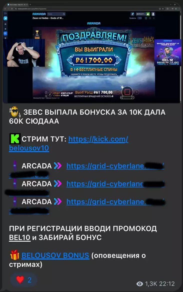 Спачатку Белавусаў рэкламаваў казіно Arcada. Вось анонс і рэферальная спасылка Белавусава ў ягоным канале.
