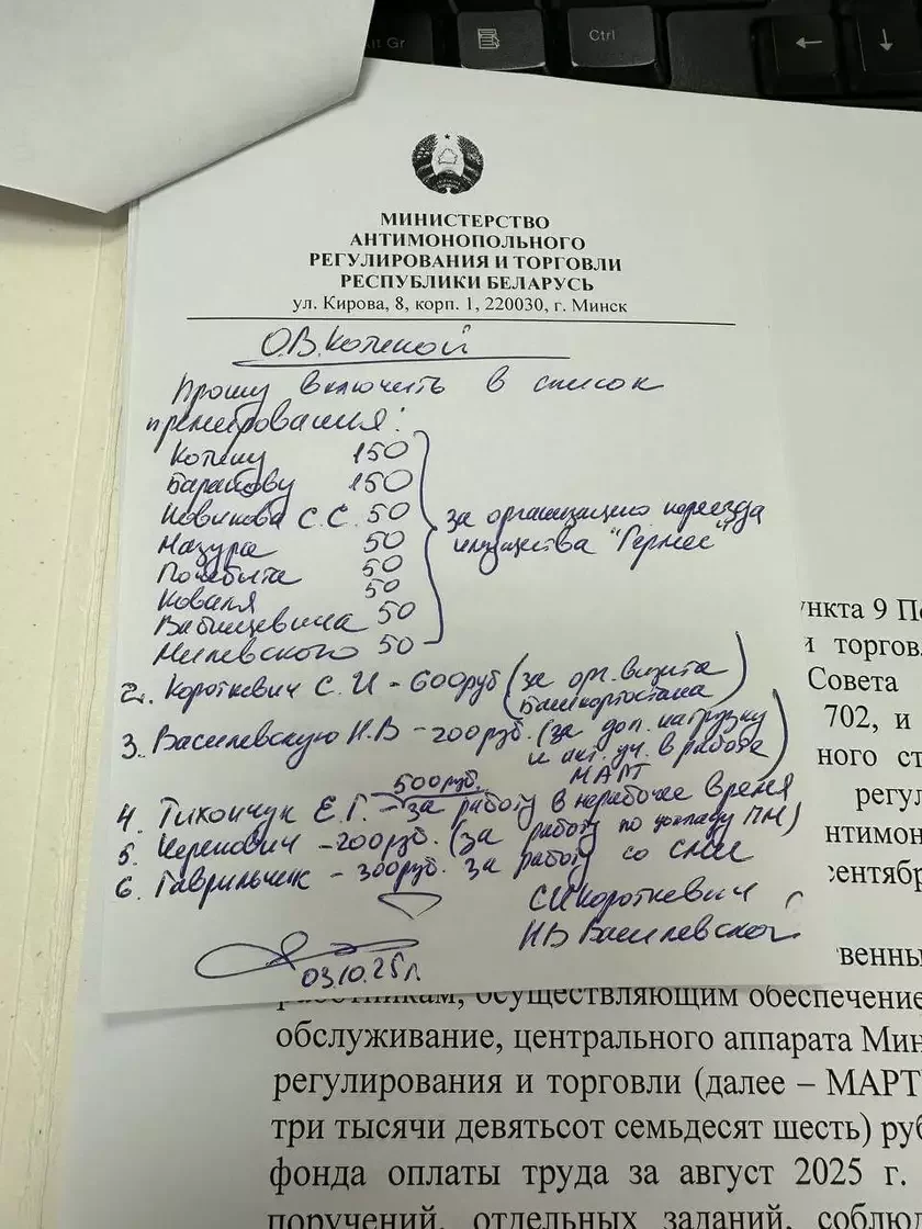 Сёння ў 15:39 у канале Міністэрства антыманапольнага рэгулявання і гандлю з'явілася і тут жа было выдалена паведамленне з унутраным дакументам. На лістку фармату А6 пазначана, каму трэба выплаціць прэміі за верасень.