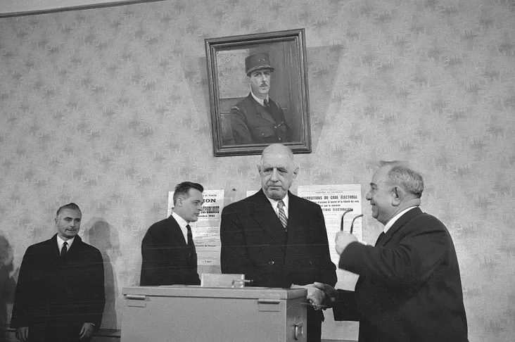 Восенню 1965 года Францыя рыхтавалася да першых у сваёй гісторыі ўсеагульных прэзідэнцкіх выбараў. Галоўная інтрыга была ў тым, ці будзе 75‑гадовы генерал зноў вылучаць сваю кандыдатуру. Кажуць, яго жонка Івона, якая ненавідзела Елісейскі палац і путы грамадскага жыцця, была катэгарычна супраць. Але дэ Голь, перакананы ў неабходнасці працягваць сваю місію, усё ж пайшоў на выбары.