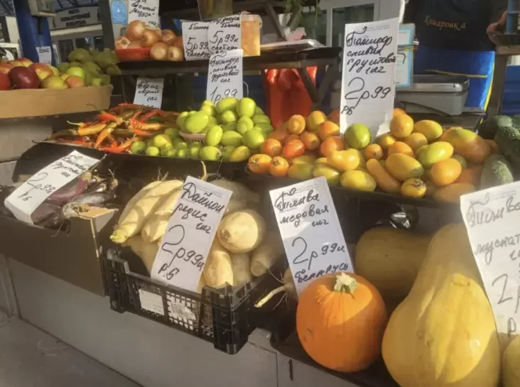 Кабачкі і баклажаны прадаюць па 2‑3 рублі за кілаграм, салодкія перцы і таматы — ад 1,99 за кілаграм, слівы — па 2,9.