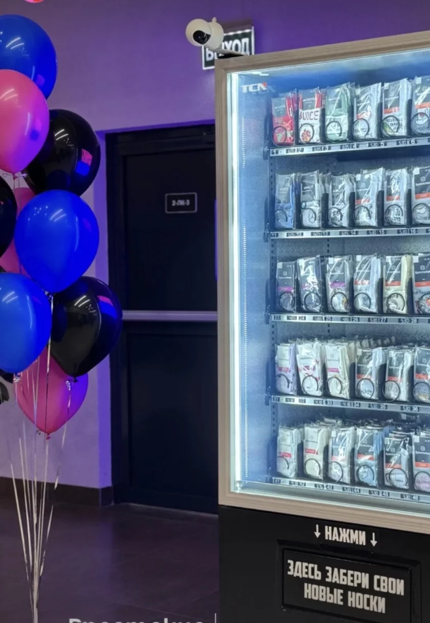Аўтамат стаіць на другім паверсе. Там можна выбраць шкарпэткі розных памераў і колераў. Пара каштуе ад 4,8 да 6 рублёў.