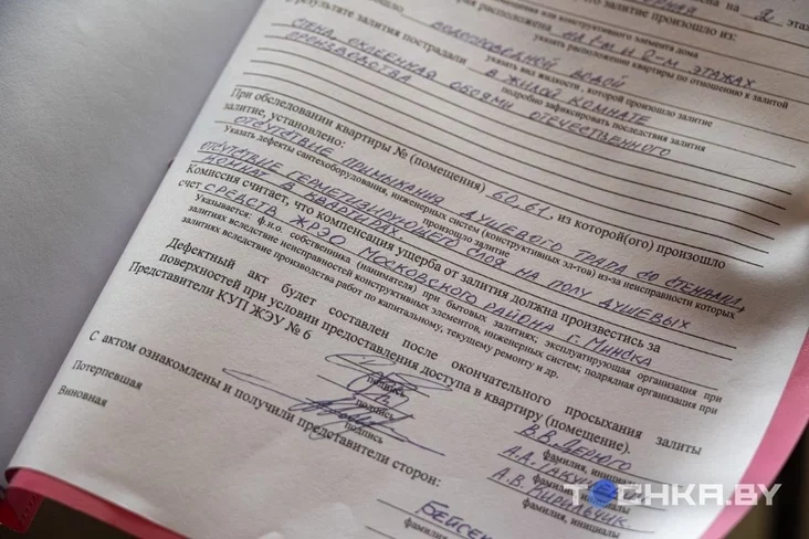 «Мы сваімі сіламі павесілі тут панэлі, каб хоць неяк дапамагчы суседзям. Вада цячэ ў кватэры з чацвёртага аж да другога паверха — проста вадаспад», — паказваюць свае ўмовы суседзі.