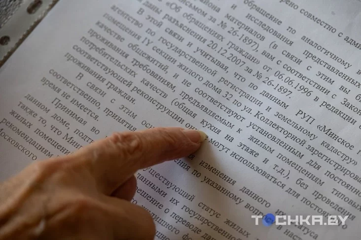 «Нам увесь час казалі, што мы — інтэрнат. І таму не можам спадзявацца на прыватызацыю. Апошнюю адмову атрымалі ў 2016 годзе. Усё па той жа прычыне — інтэрнат, нельга. Але ёсць важны нюанс», — паказвае дакументы гаспадыня трох пакояў у камуналцы.