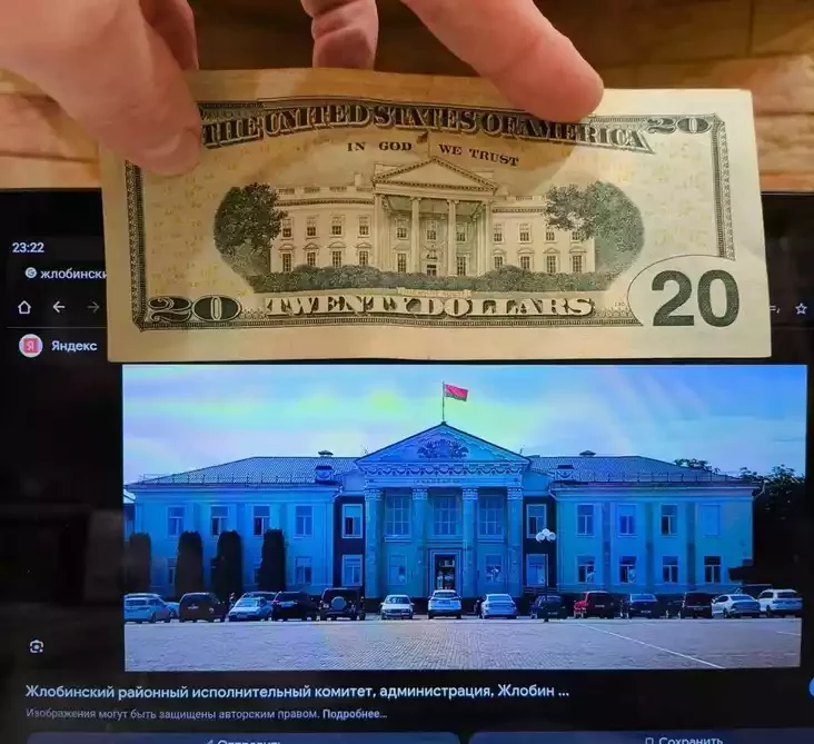 Адзін з карыстальнікаў сацсеткі падзяліўся здымкам, параўнаўшы выяву на адваротным баку купюры ў 20 амерыканскіх даляраў і фатаграфію будынка Жлобінскага раённага выканаўчага камітэта. Аўтар допісу звярнуў увагу на дзіўнае падабенства фасада Белага дома (а менавіта ён размешчаны на амерыканскай купюры) з будынкам раённай адміністрацыі аднаго з беларускіх райцэнтраў, піша «Тэлеграф».
