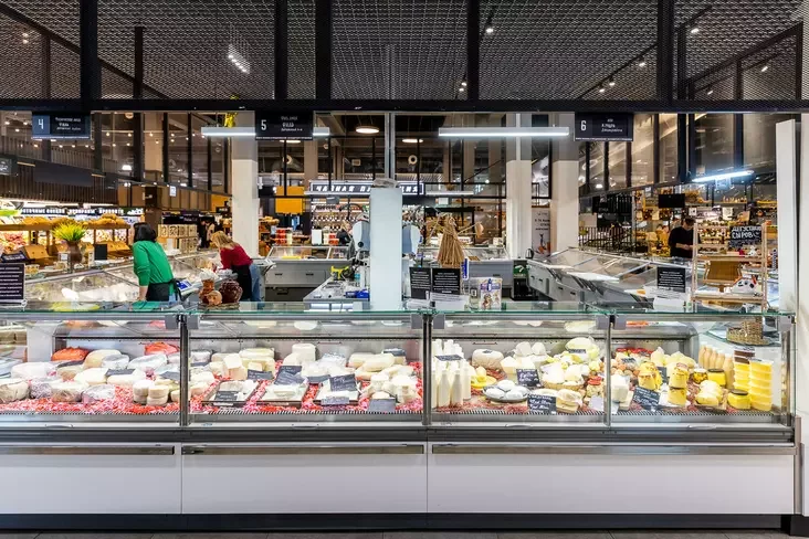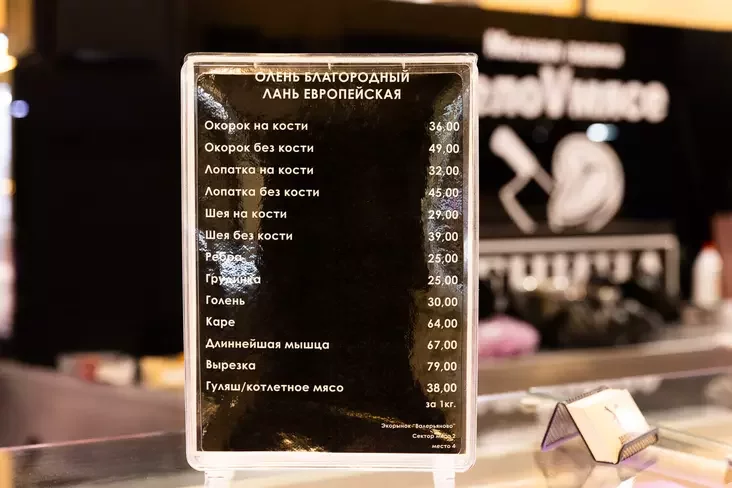 У аддзеле свежага мяса ўвагу журналістаў звяртаюць на аленіну. Дзікае мяса? Не, з паляўнічай гаспадаркі за 100 км ад Мінска.