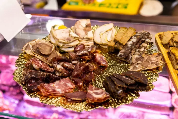 На наступным пункце прадавец паказвае хатнія паштэты, вэнджаную курыцу, каўбасы, сала.