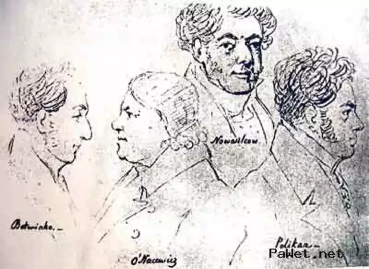 Замалёўка Станіслава Мараўскага з выявамі пракурора Гераніма Батвінкі, Ігната Анацэвіча, Мікалая Навасільцава і Вацлава Пелікана. Фота: Pawet.net