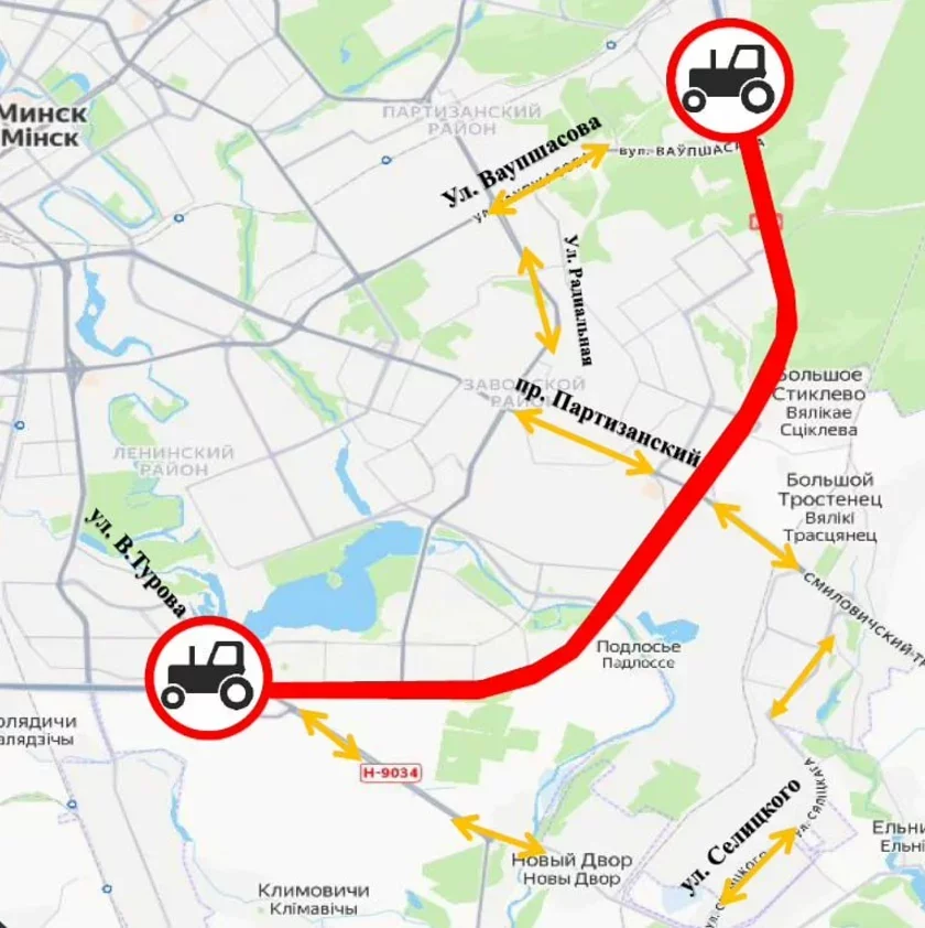 На прылеглых да МКАД участках (ад вуліцы Ваўпшасава / Ліпкаўская да вуліцы Віктара Турава, дарога Н‑9034) паставяць знакі 3.6 «Рух трактароў забаронены».