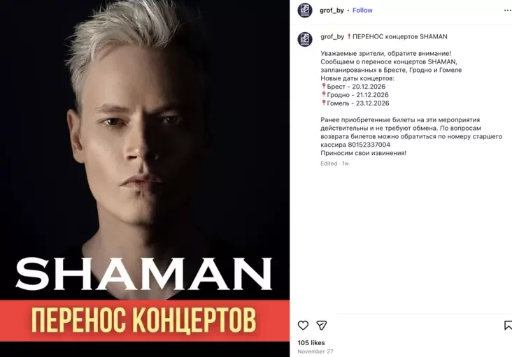 Канцэрты Шамана былі запланаваныя ў гэтым месяцы ў Брэсце, Гродне і Гомелі. Але іх перанеслі — таксама на снежань, але ўжо наступнага, 2026 года.