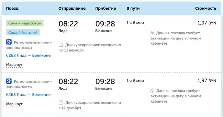 У сістэме продажу квіткоў БЧ расклад пакуль дваякі: напісана і «дні курсіравання: штодня па 13 снежня», і «дні курсіравання: штодня з 14 снежня». Час руху цалкам супадае.