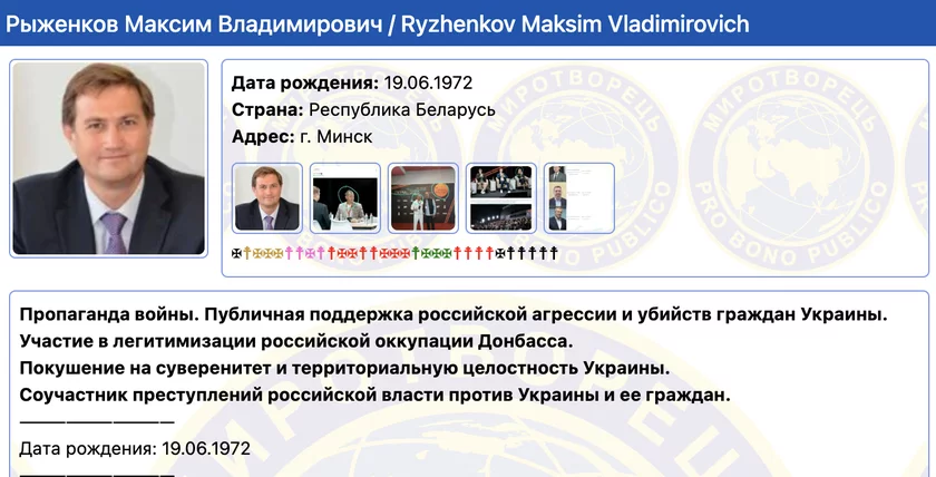 Украінскі сайт «Міратворац», які публікуе базу асоб, што, на думку стваральнікаў рэсурса, пагражаюць нацыянальнай бяспецы Украіны, унёс у свой спіс кіраўніка беларускага МЗС Максіма Рыжанкова.