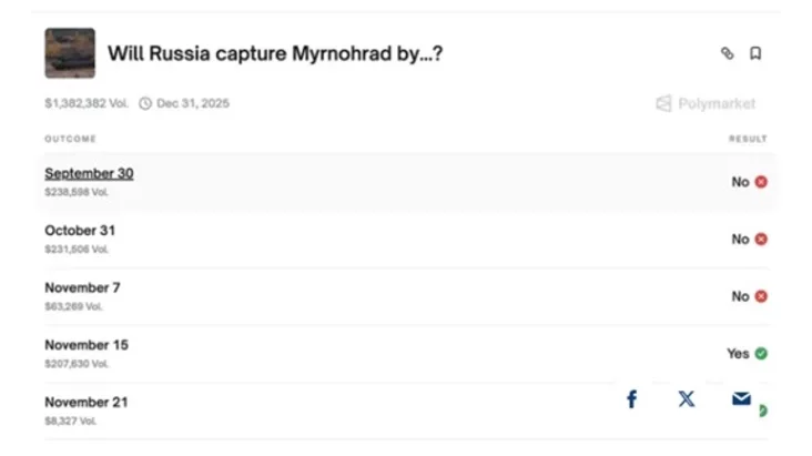 15 лістапада, калі расійскія войскі знаходзіліся на ўскраінах Мірнаграда (Данецкая вобласць), на платформе Polymarket быў адкрыты рынак ставак на захоп горада да канца сутак.