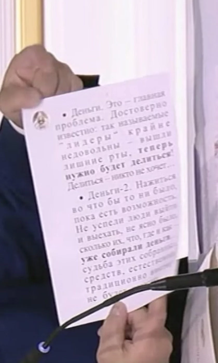 На той паперцы былі выкладзеныя тэзісы пад назвамі «Деньги» і «Деньги‑2». Тэзісы «Деньги‑2» давалі Лукашэнку падрыхтаваны матэрыял для разважанняў пра тое, што сродкі, сабраныя беларусамі на платформе «Байсол» для палітвязняў за некалькі гадзін, ужо нібыта кімсьці скрадзеныя. Але пасля ён, захапіўшыся іншымі сюжэтамі, на гэты так і не выйшаў.