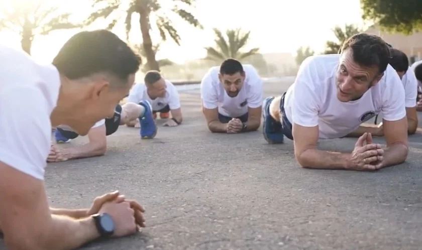 Разам з Макронам гэтым разам прыбыў адзін з самых вядомых ютубераў Францыі — Tibo InShape, які спецыялізуецца на тэматыцы бодзібілдынгу. Ён правёў з французскімі вайскоўцамі невялікі трэнінг, да якой далучыўся і прэзідэнт, выконваючы практыкаванні разам з усімі астатнімі.
