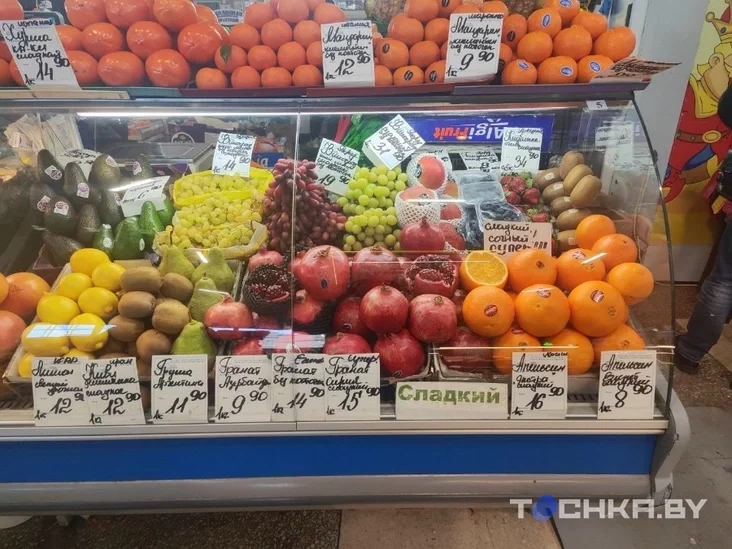 Добра прадстаўлены і вінаград. Самы танны вам прададуць за Br3,9, а вось дарагія гронкі — амаль за Br40.