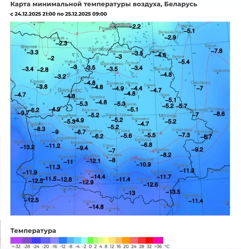 На поўначы краіны было цяплей: у Верхнядзвінску — мінус 3°С.