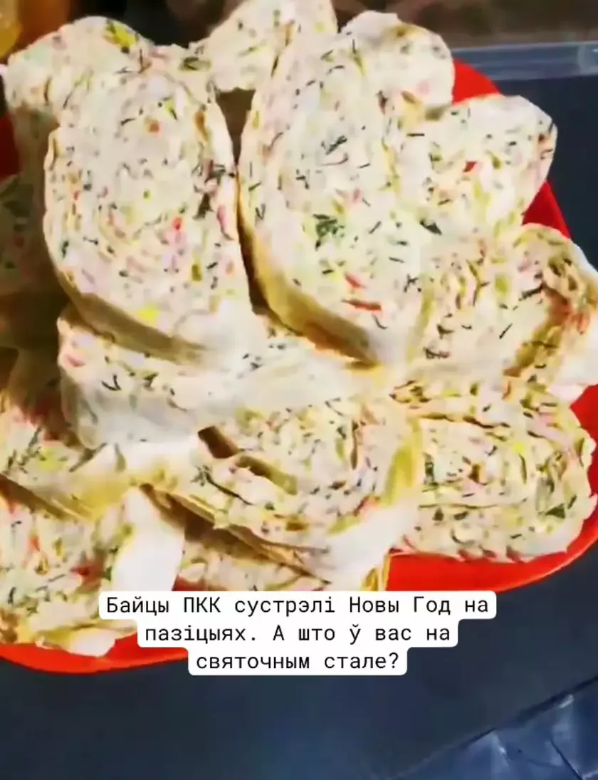 Змесцівам накрытага стала ваяры падзяліліся ў тэлеграм-канале Палка. На ім была ўлюбёная многімі беларусамі класіка — селядзец пад футрам, аліўе, бутэрброды са шпротамі, рулецікі з лаваша і крабавых палачак, смажаная курыца. Быў нават халадзец. Вядома, не абышлося і без бульбы.