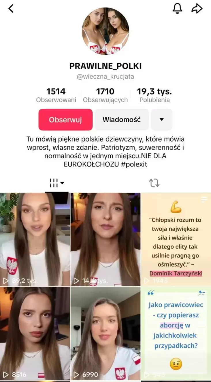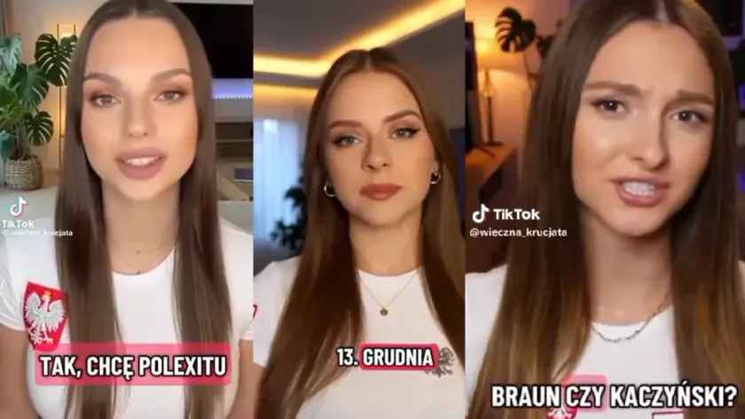 У відэароліках згенераваныя штучным інтэлектам прывабныя маладыя дзяўчыны, апранутыя ў адзенне з нацыянальнымі польскімі сімваламі, заклікаюць Польшчу здзейсніць «палэкзіт».